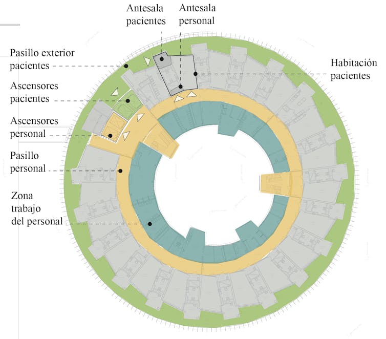 La primera de ellas es la de separar drásticamente los recorridos de pacientes de los recorridos del personal. Mientras que los pacientes infecciosos acceden a las habitaciones por unos ascensores restringidos y una circulación perimetral abierta al exterior, la circulación del personal del hospital se produce por el interior del edificio.